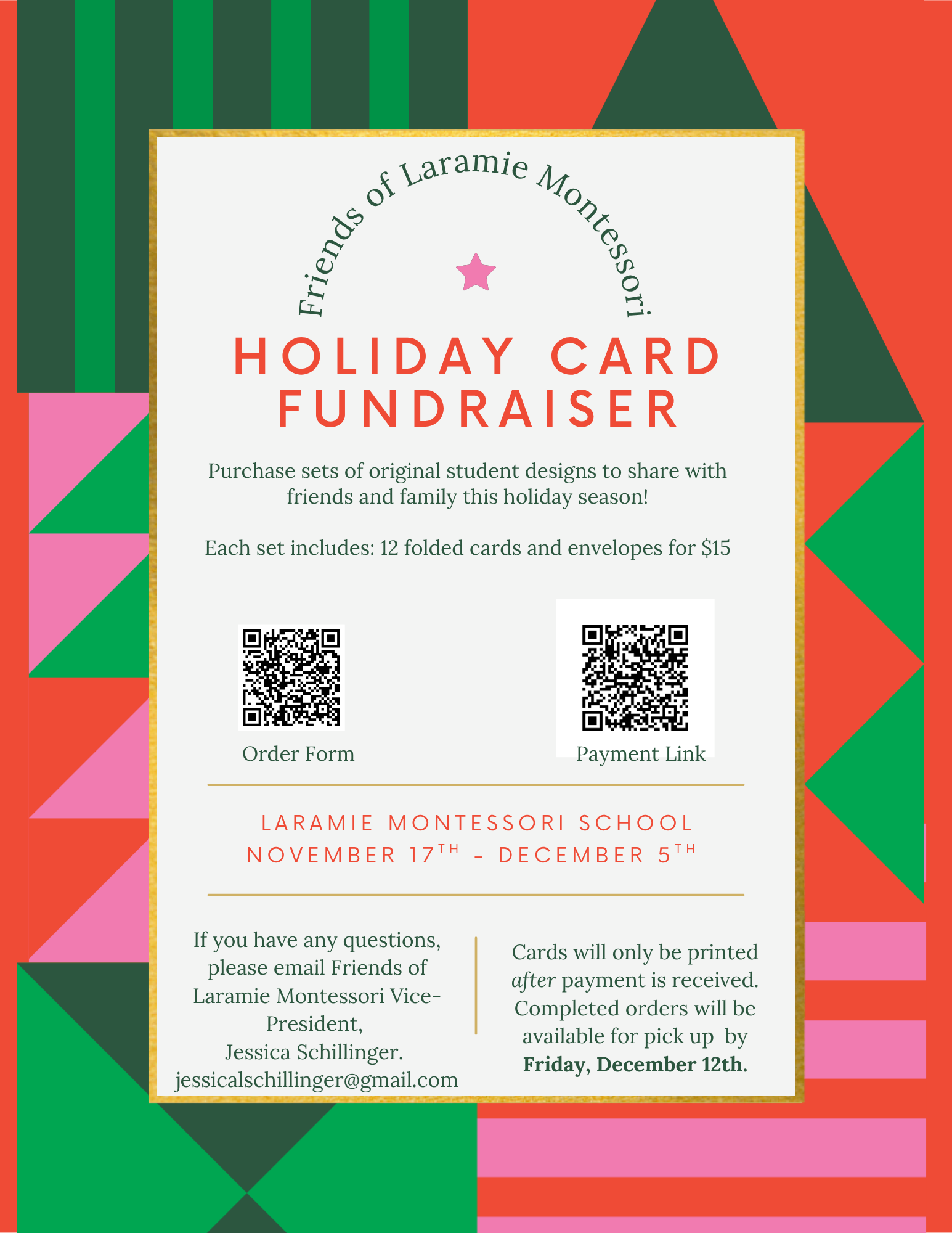 Purchase holiday cards designed by your student! Friends of Laramie Montessori is sponsoring a holiday card fundraiser! See the flyer below, and click the links to order today!